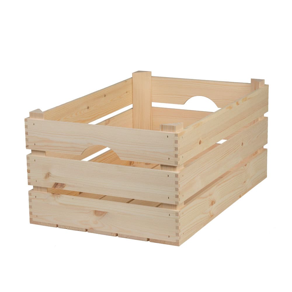 Questa cassetta è una riproduzione di quelle usate per frutta e verdura ma realizzata in modo che possa durare nel tempo ed essere particolarmente robusta tanto da essere spesso usata come elemento di arredo o come contenitore per confezioni regalo importanti. La struttura è interamente realizzata in legno massello di pino spessore 8 mm proveniente da Svezia e Finlandia di prima qualità, le giunzioni sono a pettine incollate ed inchiodate. È dotata di due comodi manici per il trasporto.
